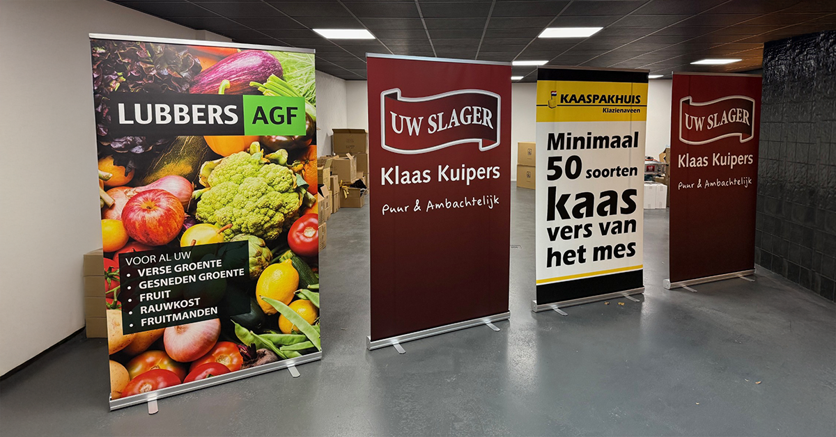Kaaspakhuis Klazienaveen, Lubbers AGF en Uw Slager Klaas Kuipers zetten hun merk in de spotlight met XL rollup banners. Flexibel, opvallend en ideaal voor diverse toepassingen. Bekijk het resultaat!